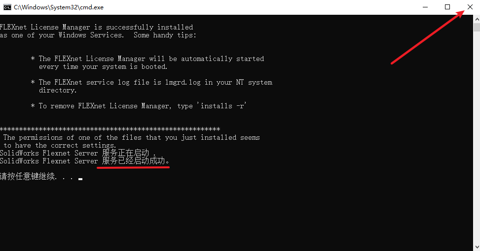 11.提示“服务已经启动成功“,点击右上角的关闭