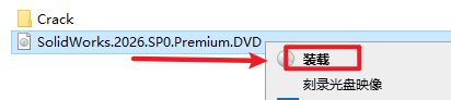 12.返回安装文件夹,选中“SolidWorks.2026.SP0.Premium.DVD”文件,右键选择“装载”(如果没有“装载”选项的可以右键选择“打开方式—Windows资源管理器”打开)