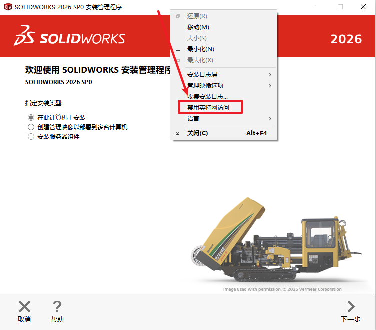 15.鼠标放在安装界面顶部,右键选择“禁用英特网访问”