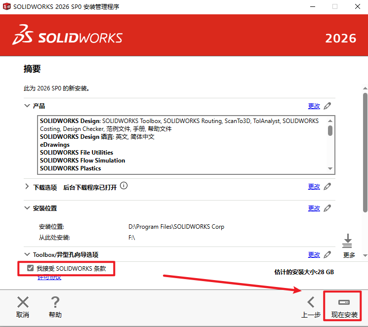 20.勾选“我接受…”,点击“现在安装”