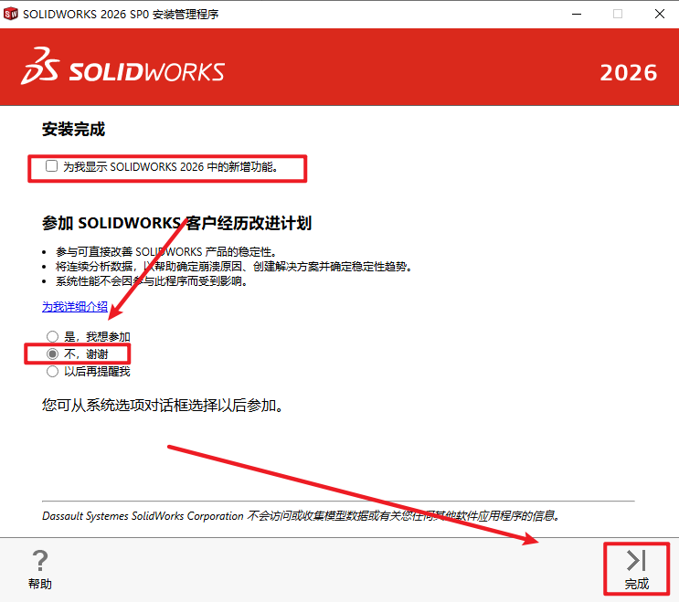 23.取消勾选“为我显示SolidWorks 2026 中的新增功能”,点选”不,谢谢”,点击”完成”