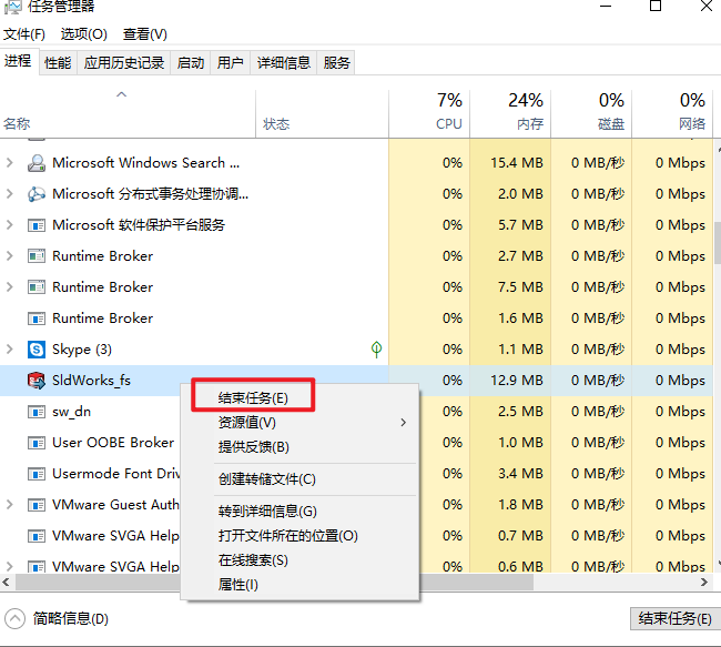24.打开任务管理器,找到并选中“sldworks_fs”右键选择“结束进程“