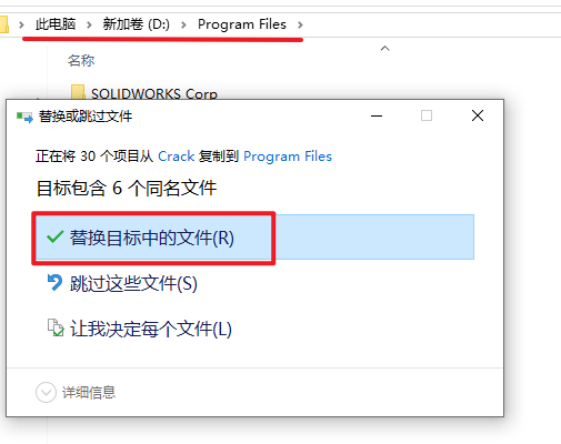 26.依次打开软件安装位置:D:\Program Files\SOLIDWORKS Corp,粘贴复制的文件到该路径下,选择“替换目标中的文件”