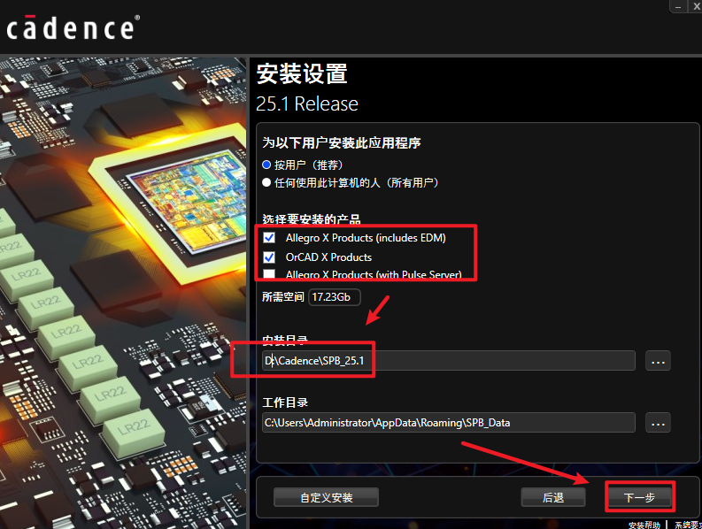 6.选择需要安装的产品,选择软件安装路径,建议和教程中的保持一致,安装路径不要出现中文,记住安装路径,后面会用上,点击“下一步”