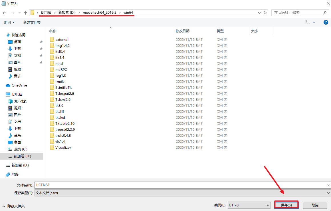 16.选择保存路径“C:\modeltech64_2019.2\win64”(参看第4步),点击“保存”
