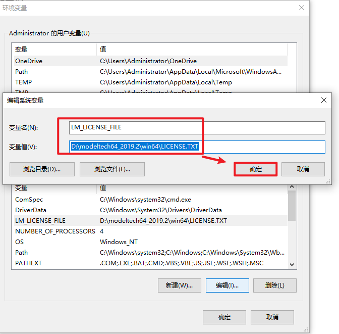 变量值:C:\modeltech64_2019.2\win64\LICENSE.TXT(第18步保存“LICENSE.TXT”文件的路径)