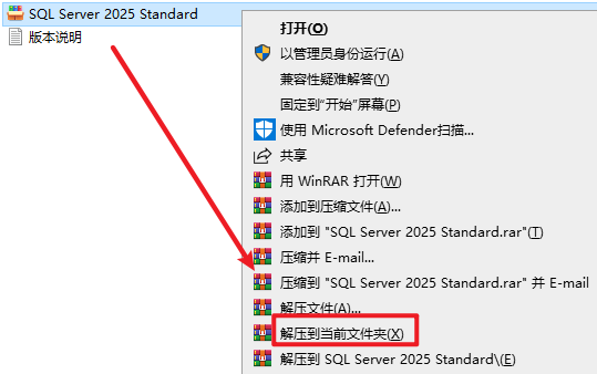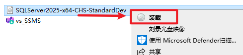 2.打开刚刚解压的文件夹,选中“SQLServer2025-x64-CHS-StandardDev”文件,右键选择“装载”(如果没有“装载”选项的可以右键选择“打开方式—Windows资源管理器”打开)