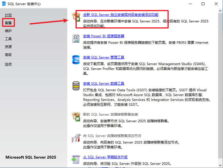 3.点击“安装”,点击“全新SQL Server独立安装或向现有安装添加功能”
