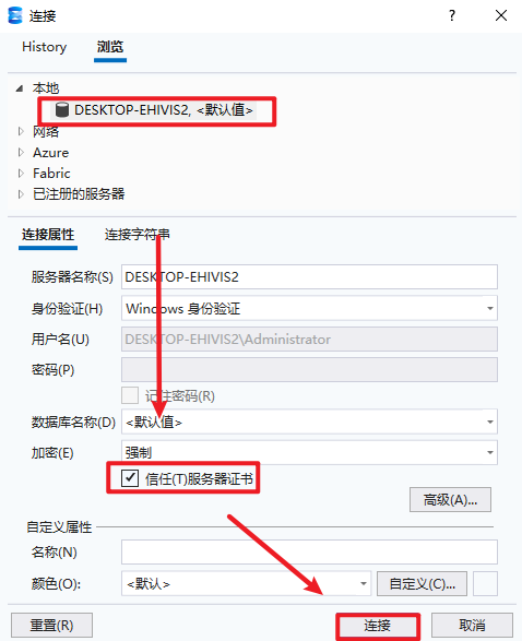 25.点击“浏览”,选择本地服务器,勾选“信任服务器证书”,点击“连接”