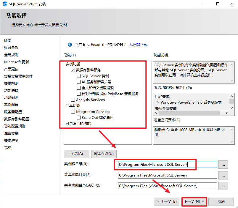 8.根据需要勾选安装的功能,自定义安装位置,本例安装在D盘,点击“下一步”