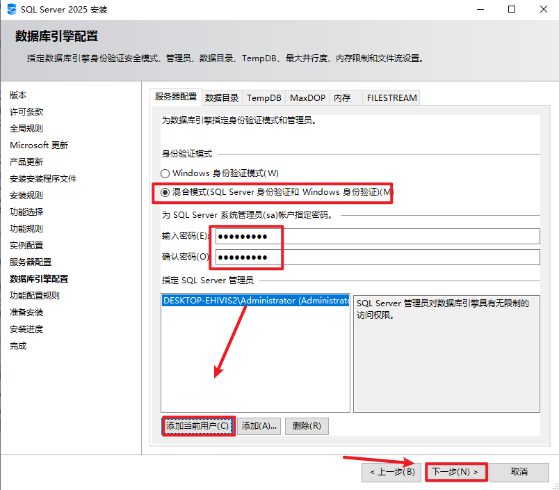 11.选择“混合模式“,输入密码,点击“添加当前用户“,点击“下一步”