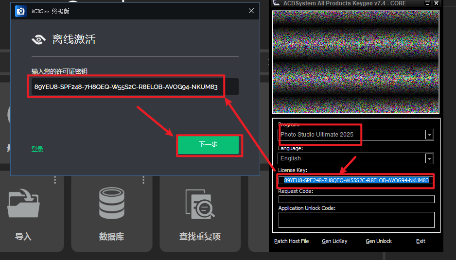 13.在Program选择“Photo Studio Ultimate 2025”,将生成的License Key复制到许可证密钥,点击“下一步”