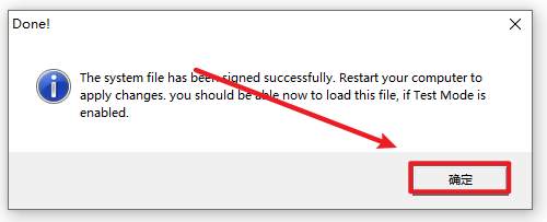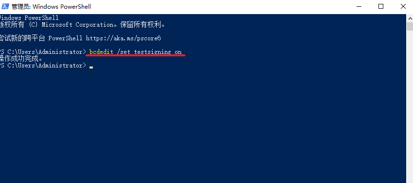 39.在Powershell窗口中输入:bcdedit /set testsigning on,点击回车(Enter)键,显示“操作成功完成”后,重启电脑(必须),在电脑右下角显示测试模式即表示成功