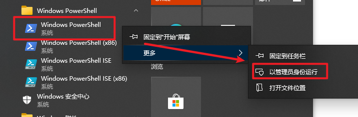39.右键38.在开始菜单找到 “Windows Powershell”右键选择“以管理员身份运行”