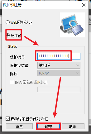 25.点击“硬件锁“,在保护锁号处输入16个1,“1111111111111111”,点击“确定”