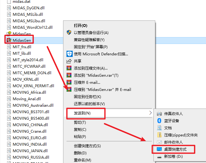 16.继续在文件夹下,找到并选中“MidasGen”文件,右键选择“发送到—桌面快捷方式”