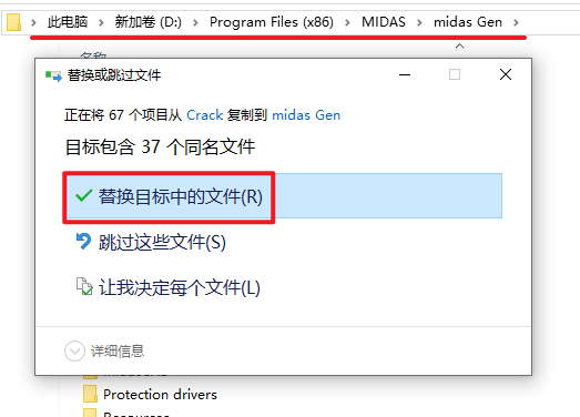 14.依次打开软件安装路径:D:\Program Files (x86)\MIDAS\midas Gen,粘贴复制的文件夹到该路径下,选择“替换目标中的文件”