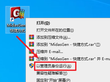 19.在桌面上找到”MidasGen.exe – 快捷方式“软件图标,右键选择“以管理员身份运行”