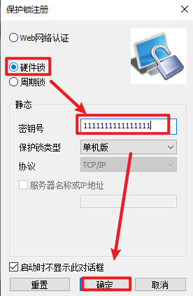 21.点击“硬件锁“,在保护锁号处输入16个1,“1111111111111111”,点击“确定”