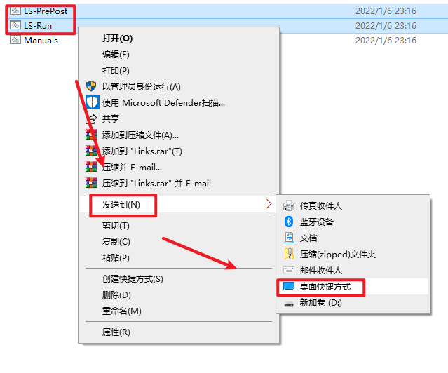 20.返回D盘软件路径:D:\LS-Dyna\Links,分别选中”LS-PrePost.bat“和LS-Run.bat文件生成桌面快捷方式