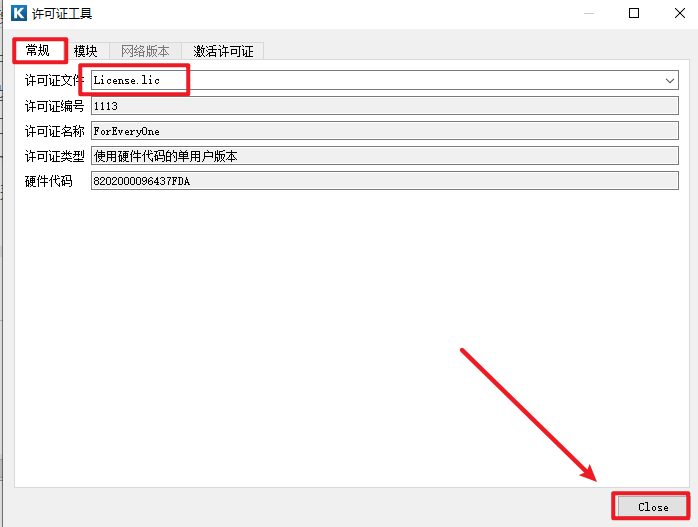 23.点击“常规”,许可证文件下拉选择“License.lic”,点击“Close”