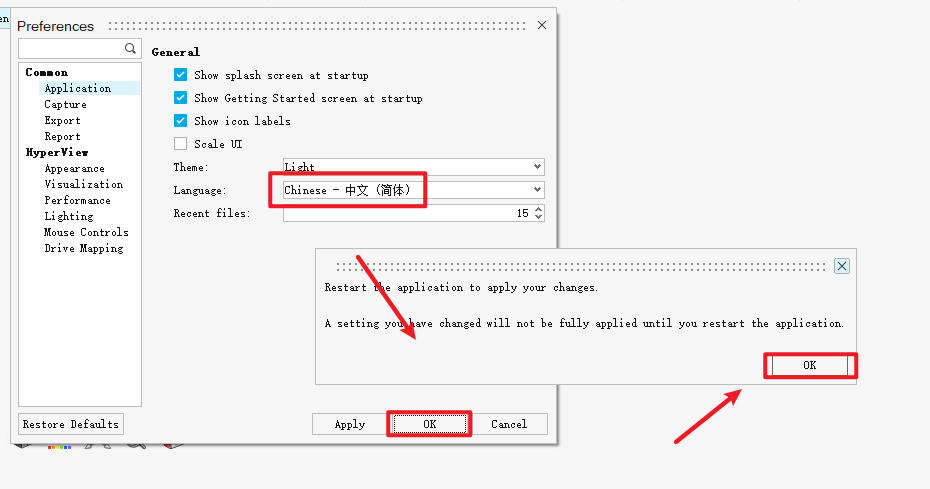 18.将“Language“设置为“Chinese – 中文(简体)“,点击“OK“,点击“OK“,关闭软件