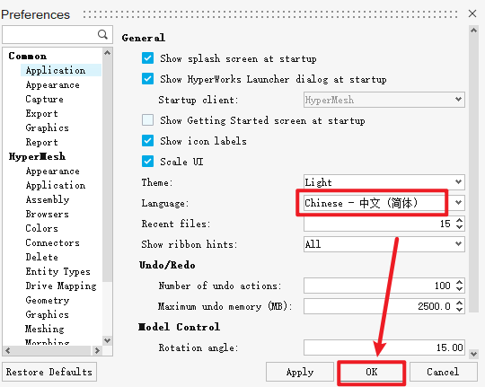 25.将“Language“项设置为“Chinese – 中文(简体)“,点击“OK”