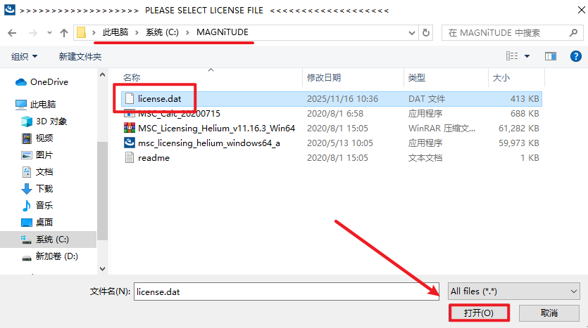 12.选择C盘根目录,双击打开“MAGNiTUDE”文件夹,找到并选中生成的许可证文件“license.dat“,点击“打开“