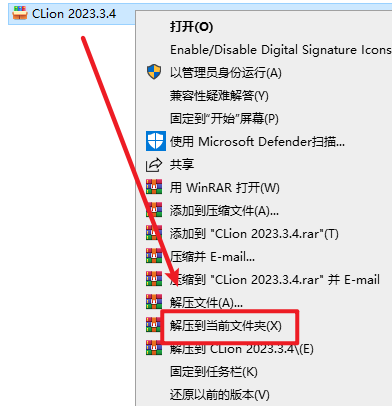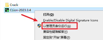 2.打开刚刚解压的文件夹,选中“CLion-2023.1”右键选择“以管理员身份运行”