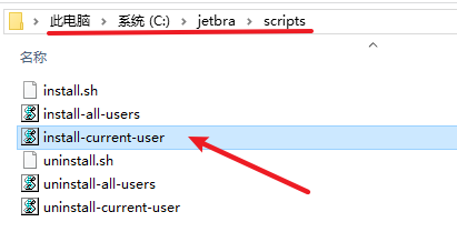 11.双击打开复制过来的“jetbra”文件夹,再打开“scripts”文件夹,双击运行“install-current-user”文件