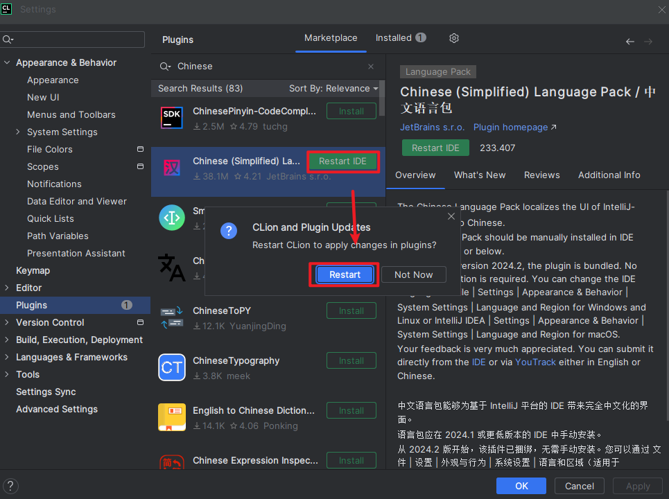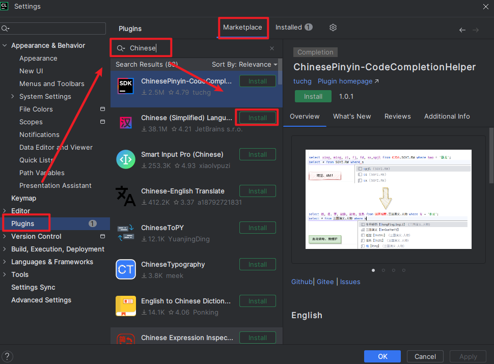 23.点击“Plugins“,点击“Marketplace“,输入:Chinese,找到“Chinese(simplified)“,点击“install“,等待下载安装