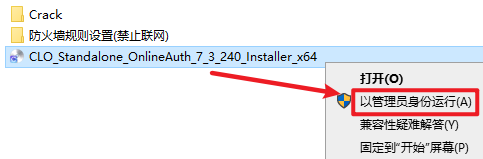 2.打开刚刚解压的文件夹,选中“CLO_Standalone_OnlineAuth_7_3_240_Installer_x64”右键选择“以管理员身份运行”