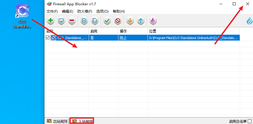 15.点击“入站规则”,将CLO Standalone OnlineAuth再次拖动到程序界面中