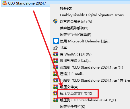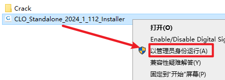 2.打开刚刚解压的文件夹,选中“CLO_Standalone_2024_1_112_Installer”右键选择“以管理员身份运行”