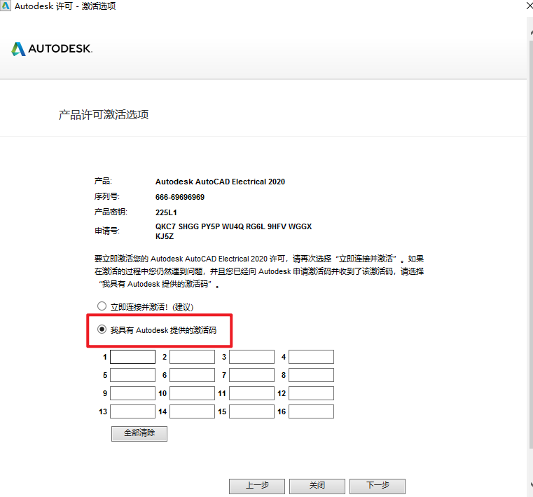 15.选择“我具有Autodesk提供的激活码”