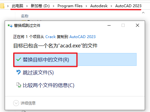 9.返回安装文件夹,双击打开“Crack”文件夹,复制“acad”文件