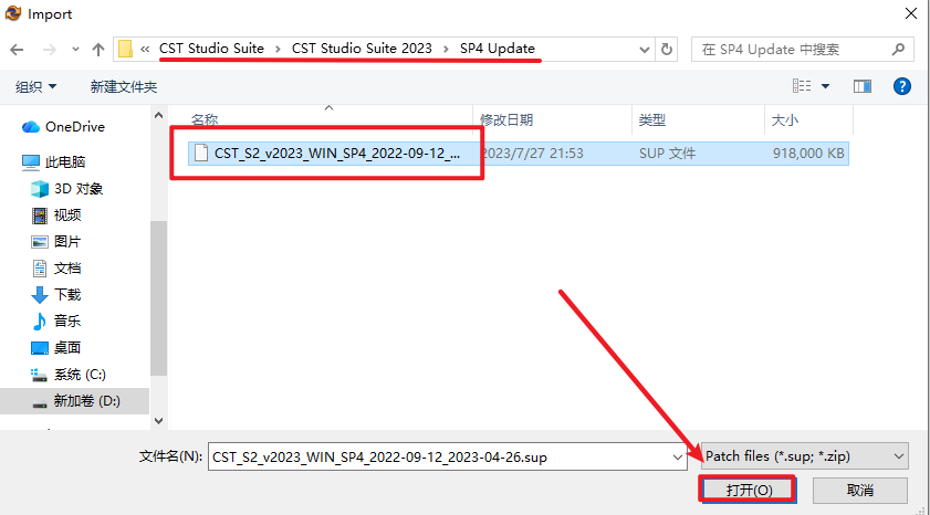 12.打开安装包路径里面的“SP4 Update”文件夹,选中“CST_S2_v2023_WIN_SP4_2022-09-12_2023-04-26.sup”升级文件,点击“打开”