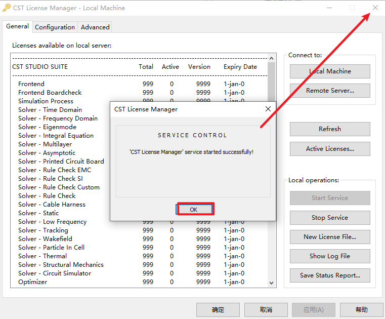 33.提示“successfully!”表示服务启动成功,点击“OK”,点击右上角的关闭