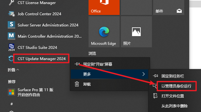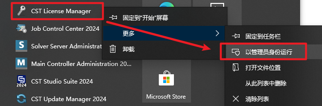 10.在开始菜单栏中找到并选中“CST Update Manager 2024”程序,右键选择“以管理员身份运行”