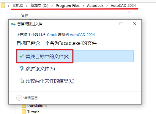 7.返回安装文件夹,双击打开“Crack”文件夹,复制“acad”文件