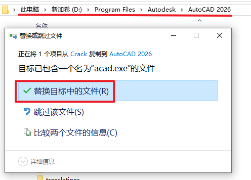 7.返回安装文件夹,双击打开“Crack”文件夹复制“acad”文件