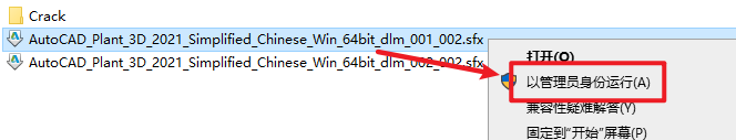 2.打开刚刚解压的文件夹,选中“AutoCAD_Plant_3D_2021_Simplified_Chinese_Win_64bit_dlm_001_002.sfx”右键选择“以管理员身份运行”