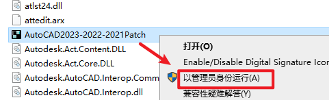 12.选中粘贴过来的“AutoCAD2023-2022-2021Patch.exe”文件,右键选择“以管理员身份运行”