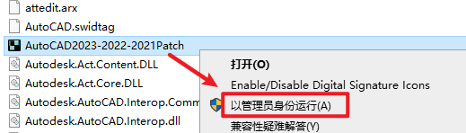 11.选中粘贴过来的“AutoCAD2023-2022-2021Patch”文件,右键选择“以管理员身份运行”