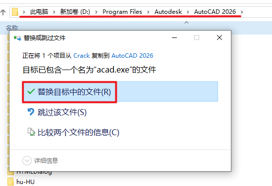 7.返回安装文件夹,双击打开“Crack”文件夹,复制“acad” 文件