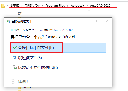 8.返回安装文件夹,双击打开“Crack”文件夹,复制“acad”