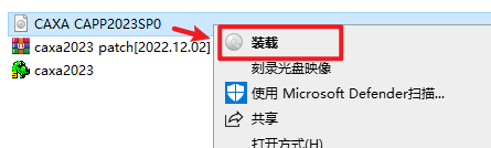 2.打开刚刚解压的文件夹,选中“CAXA CAPP2023SP0.iso”文件,右键选择“装载”(如果没有“装载”选项的可以右键选择“打开方式—Windows资源管理器”打开,win7系统请右键解压文件)
