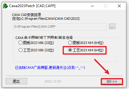 11.勾选安装的版本“工艺2023 X86”(32位操作系统)或“工艺2023 x64“(64位操作系统),本例选择“工艺2023 x64”,点击”GO>>”