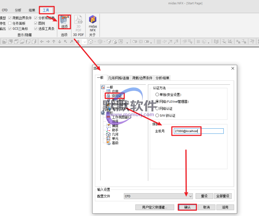 24.依次点击“工具–选项–许可证–网络(FLEXnet管理器)–主机号输入:27880@localhost,点击”确认“