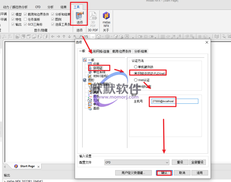 25.依次点击“工具–选项–许可证–网络许可证(FLEXnet)–主机号输入:27880@localhost,点击”确认“